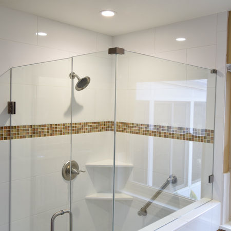 For the standing shower and surrounding tub in the master bath, we chose 12"x24" white porcelain tile with a shimmering glass border as a stylish accent. Porcelain tile is not only durable but also maintains its appearance for years, making it an ideal material for frequently used showers. To create a cohesive look, we selected a light brown mosaic for the shower floor tile, which added subtle contrast to the white shower walls. The shower floor tile features a matte or semi-gloss finish to help prevent slipping.
