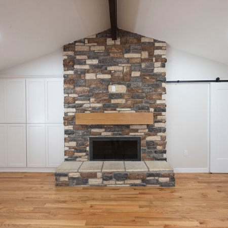 Custom fireplace mantel refaced and upgraded to match the cabinetry and stone elements