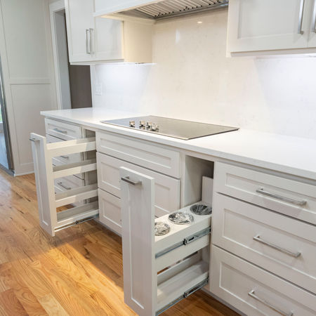 Thoughtful details: lift cabinets, spice drawers, pullout trash bins, appliance integration