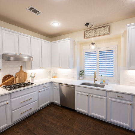 To enhance the kitchen's aesthetic, we installed new white quartz countertops with subtle grey accents, introducing an elegant and timeless look. The cabinets were refaced in an off-white color, further contributing to the clean and minimalistic appearance. We also incorporated new lighting fixtures to brighten the space and accentuate the updated design elements.